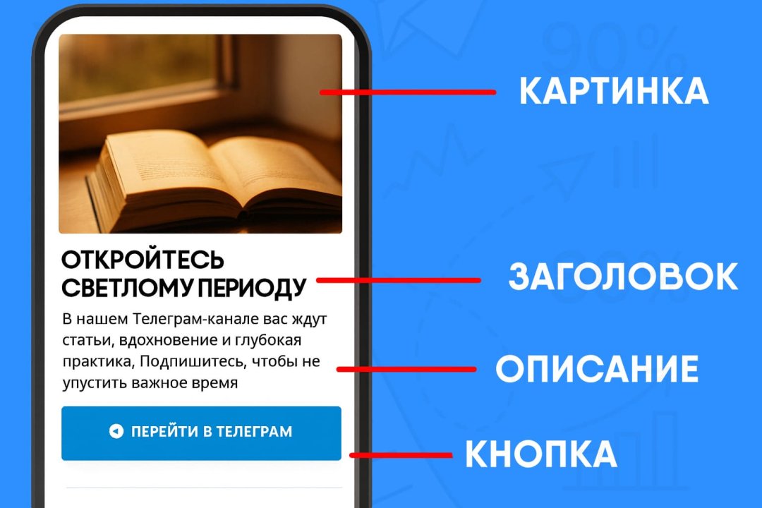 1. В Телеграм-канале клиента, выбрали 2 самых конверсионных поста, с цепляющими для аудитории темами. Добавили в посты призывы к действию "Подписаться на канал". Подготовили рекламные креативы.
