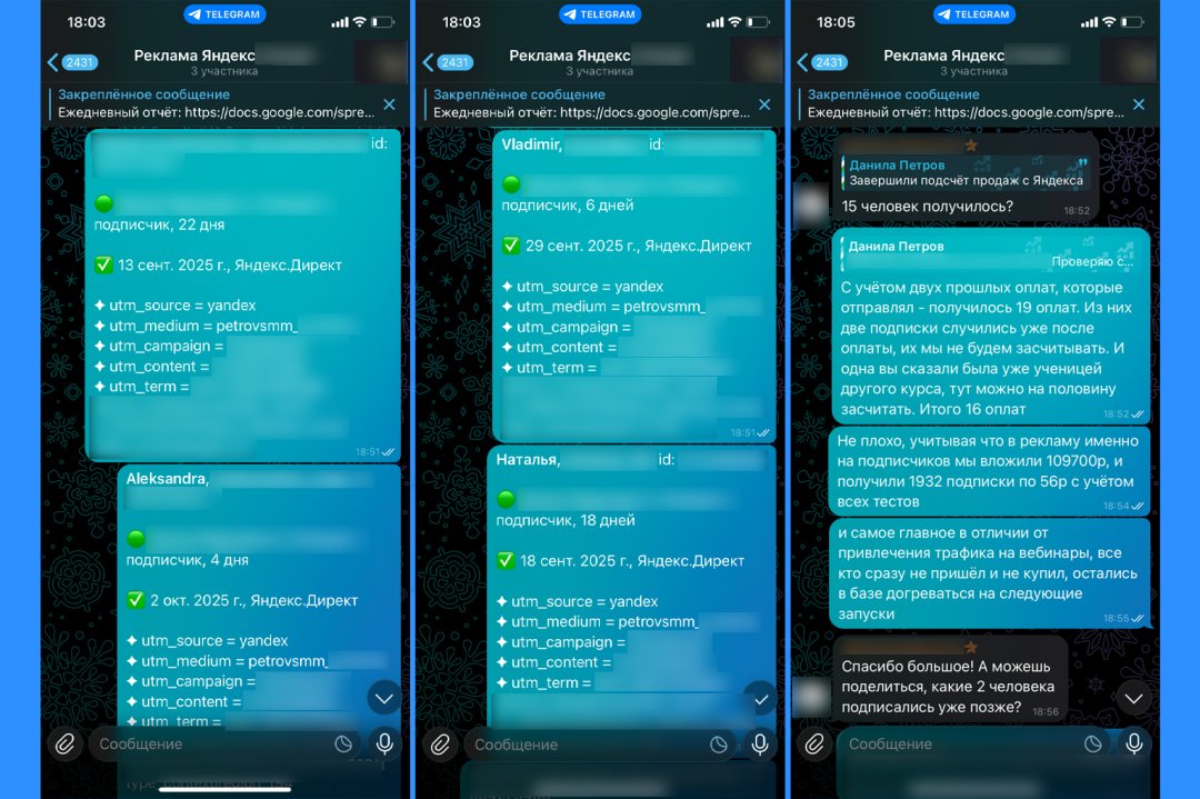 Продажи отслеживали просто. При оплате, клиент собирал у пользователей tg_username. Мы пробивали его по utm-меткам, и находили тех, кто пришёл из Яндекс.