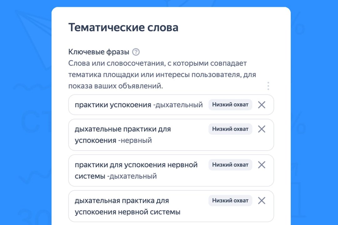 4. Собрали целевые аудитории. Для настройки рекламы использовали в основном низко-частотные ключи + автоматический таргетинг Яндекса.