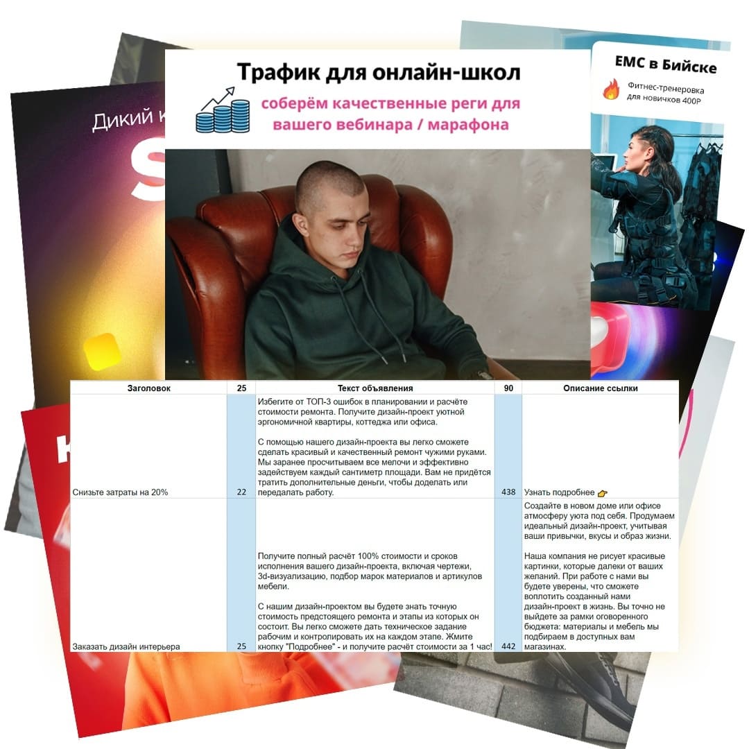 Делаем от 5 до 15 креативов. Чаще всего это простые статичные картинки. Упор в креативах делаем не на яркий дизайн, а на эффективность (лиды по KPI).